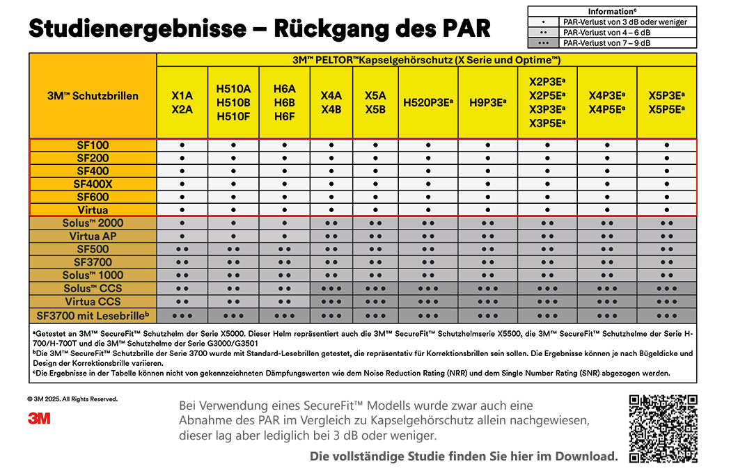 Die Studie belegt eine Abnahme des PAR für Kombinationen von Kapselgehörschützern, die zusammen mit einer Schutzbrille getragen werden, im Vergleich zu Kapselgehörschützern allein. Aber genau dieser beobachtete Rückgang der PAR-Werte kann dem Gesundheits- und Sicherheitsexperten bei der Auswahl von Produktkombinationen helfen, den Dämmverlust des Kapselgehörschutzes zu minimieren. So haben zum Beispiel die getesteten SecureFit™ Modelle lediglich einen Verlust von 3 dB oder weniger.