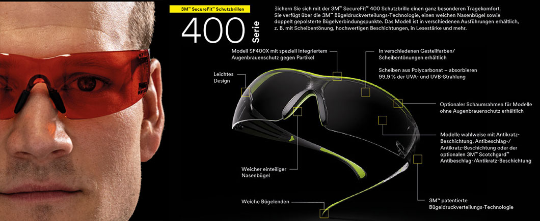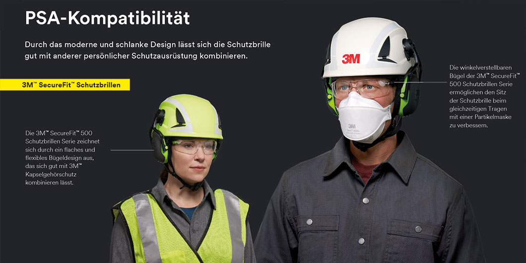 Die 3M™ SecureFit™ Familie bietet eine große Auswahl an Schutzbrillen. Alle Modelle zeichnen sich durch hohen Tragekomfort, zuverlässigen Schutz und ein ansprechendes Design aus. Wie bei jeder persönlichen Schutzausrüstung gibt es auch beim Augenschutz einen engen Zusammenhang zwischen Tragekomfort und Trageverhalten. Eine Schutzbrille, die nicht richtig sitzt, kann auch nicht richtig schützen. Darüber hinaus spielt auch die Kompatibilität zur weiteren Schutzausrüstung wie Helm oder Gehörschutz eine wichtige Rolle.