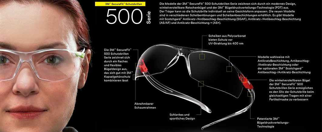 Die Modelle der 3M™ SecureFit™ 500 Schutzbrillen Serie zeichnen sich durch ein modernes Design, winkelverstellbare Ratschenbügel und der 3M™ Bügeldruckverteilungs-Technologie (PDT) aus. Der Träger kann so die Schutzbrille individuell an seine Gesichtsform anpassen. Die neuen Modelle sind in verschiedenen Scheibentönungen und Scheibenbeschichtungen erhältlich. Es gibt Modelle mit Scotchgard™ Antikratz-/Antibeschlag-Beschichtung (SGAF), Antikratz-/Antibeschlag-Beschichtung (AS/AF) und Antikratz-Beschichtung + (AS+).